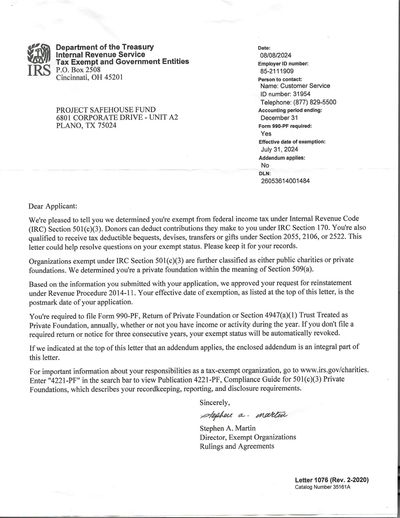 Project Safehouse Fund is a registered nonprofit organization (501c3) under the EIN: 85-2111909. This organization was formed by Matt Combs (Director and located in Plano, TX) and PSG (located in Boston). All matters related to Project Safehouse Fund should be sent to Matt Combs at the email provided below.